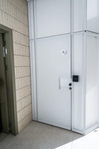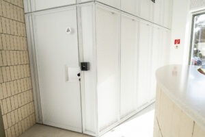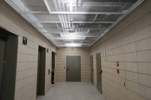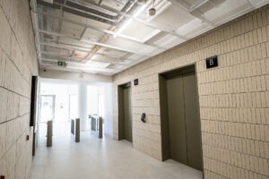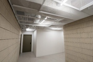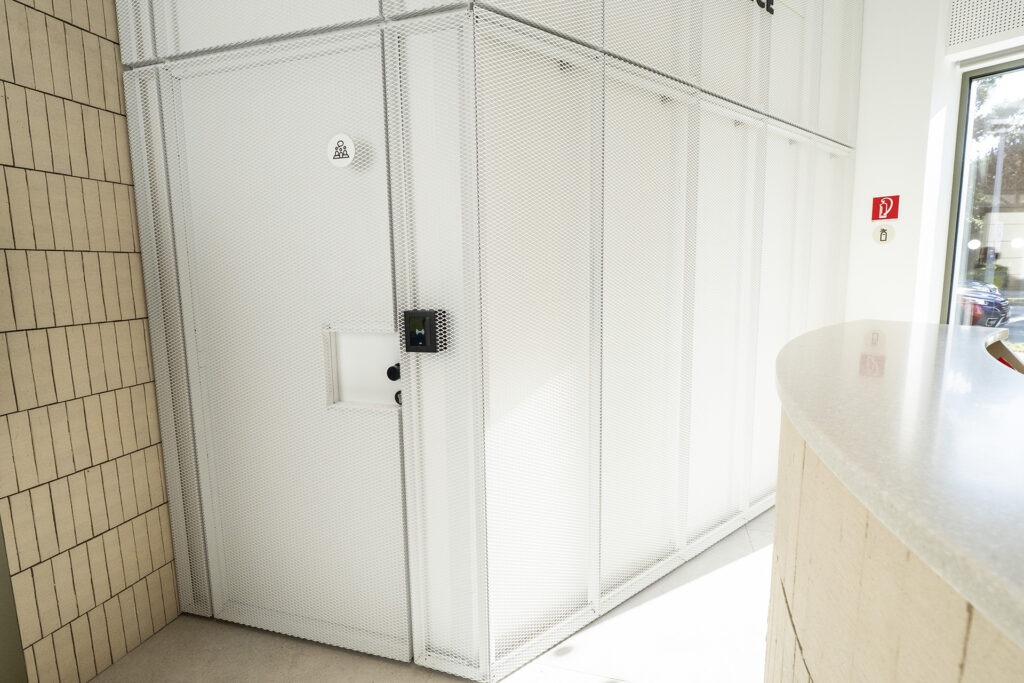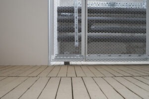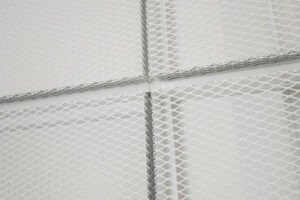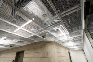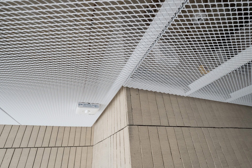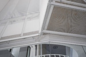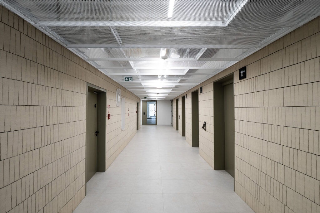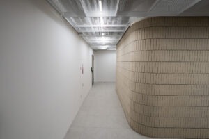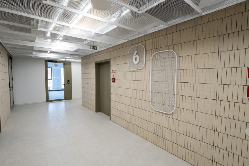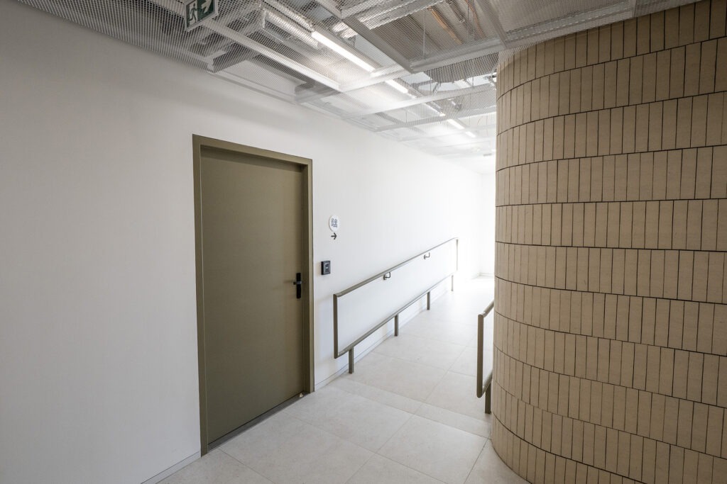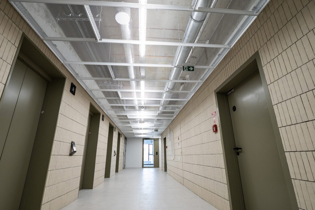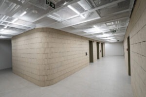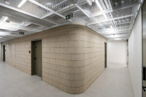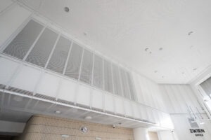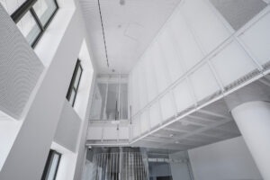 A práve vstupná lobby s použitím tohto materiálu v bielej farbe dostala industriálny nádych, ktorý sa tomuto miestu nesmierne hodí. Ak potrebujeme riešiť vo vstupnej lobby čas dozvuku, potrebujeme plochy zabezpečiť pohltivými materiálmi. Ťahokov sám o sebe priestorovú akustiku nevytvorí, je však perforovaný a to znamená, že nám umožní dostať zvuk skrz materiál. V tomto medzipriestore zvuk už vieme účinne pohlcovať.