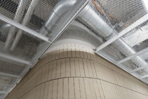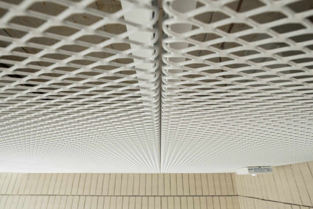 Tak tomu bolo aj v tomto prípade. Na stenách sa použili ťahokovové platne, ktoré sme odsadili od zvislej steny a ako pohltivá vrstva sú použité dosky Ecophon Industry z minerálnej vlny kašírované bielou textíliou. Dosiahli sme tak akustický efekt bez toho, aby pohltivé prvky bolo vidieť alebo, aby pôsobili rušivo. Celá konštrukcia bola v bielej farbe vrátane dosiek z minerálnej vlny, čo ich v konečnom dôsledku urobilo neviditeľnými a zvýraznila sa tak štruktúra ťahokovových platní.